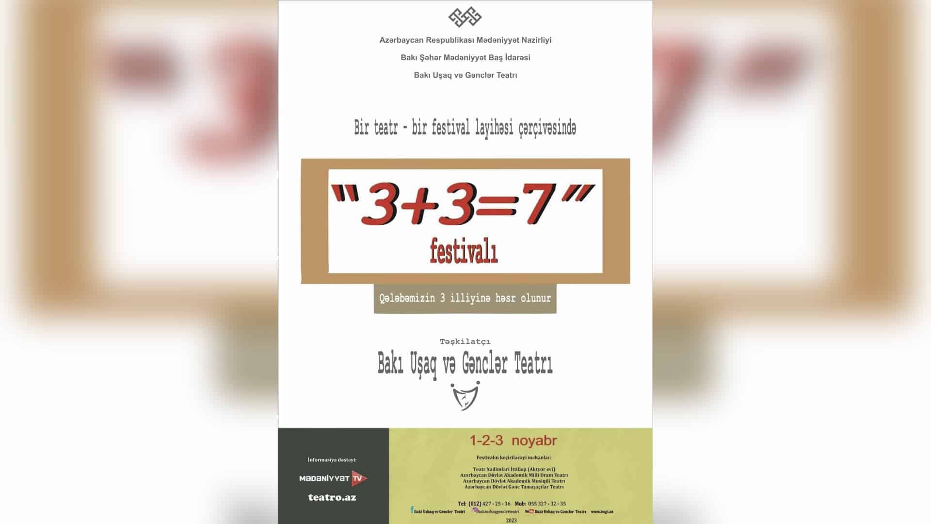 Qeyd edək ki, Şanlı Qələbəmizin 3-cü ildönümü münasibətilə “Bir teatr – bir festival” layihəsi çərçivəsində 1-3 noyabr tarixlərində “3+3=7” festivalı keçirilib. Festival Azərbaycan Teatr Xadimləri İttifaqının tamaşa zalında, Azərbaycan Dövlət Akademik Milli Dram Teatrının, Azərbaycan Dövlət Akademik Musiqili Teatrının və Gənc Tamaşaçılar Teatrının səhnəsində baş tutub